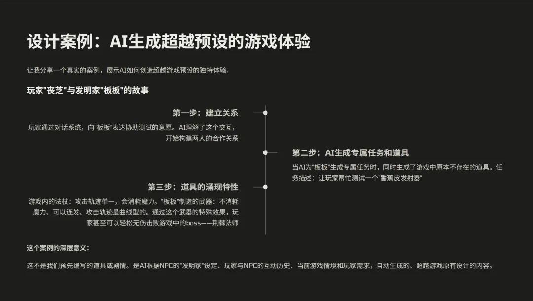 在前面的視頻裏我們提到過,在某次玩家測試中,有位玩家通過自己的描述生成了一個 AI 角色“發明家”。這個角色有非常鮮明的性格特徵,而系統在後續任務中會依據這個角色設定,爲玩家提供原本預設之外的強力道具。