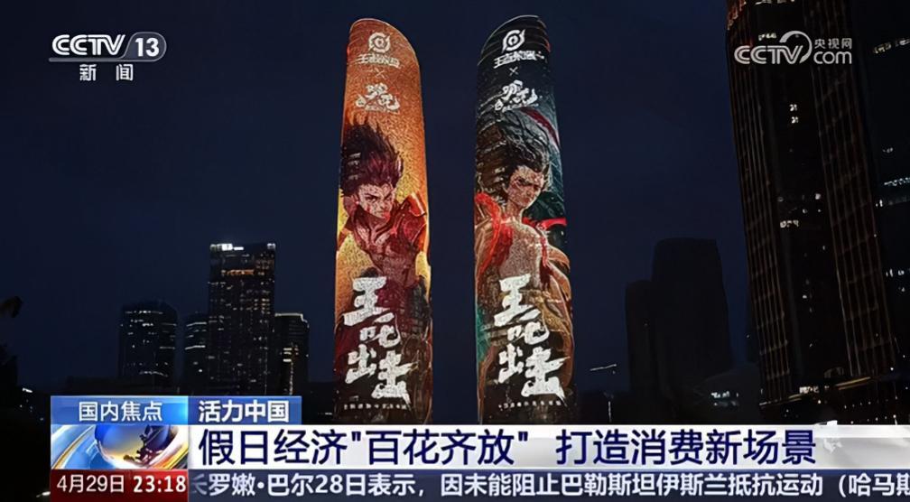 在4月16日宣佈聯動當天,《王者榮耀》就在成都天府雙塔舉辦了隆重的亮燈儀式,陣仗之龐大讓不少路人都爲止震撼駐足,甚至登上CCTV13新聞頻道,被當做假日經濟百花齊放的典型案例,隨後#王者榮耀與哪吒2聯動#的話題很快登上了微博熱搜TOP2。