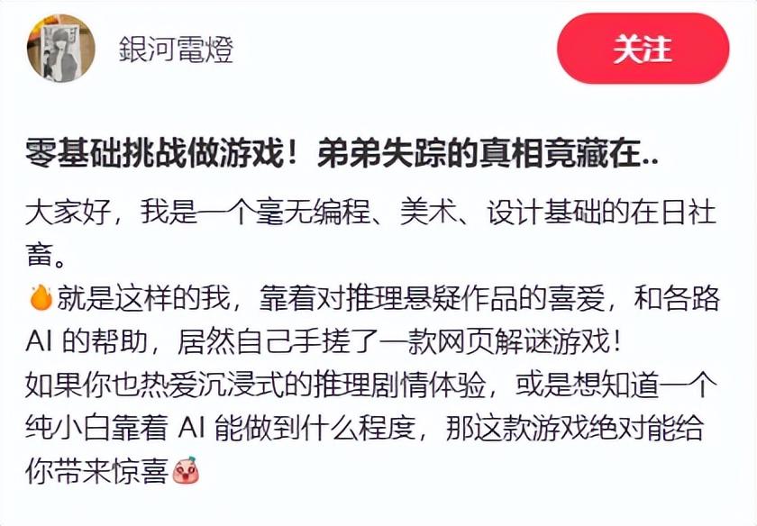 你可能很難想象,在這個多數創作者擔心自己使用AI會被避雷的創作環境下,作者@銀河電燈_卻敢在遊戲自薦帖中毫不避諱地點明:自己在遊戲製作方面完全是零基礎,而這款遊戲除了劇本故事之外,全流程都由AI製作而成。