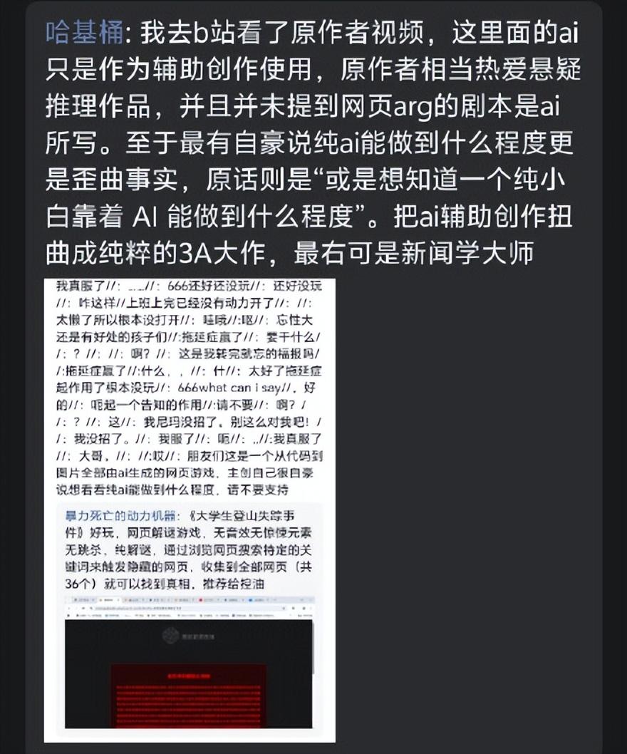 照理來看,《大學生登山失蹤事件》之於他們,其實並沒有太多的吸引力。那,爲什麼還會這樣有一批老玩家,甚至是遊戲製作人慕名去玩呢?我想,它的噱頭之一——AI創作,或許會是其中一個答案。至少,我確實是被這麼吸引來看熱鬧的。