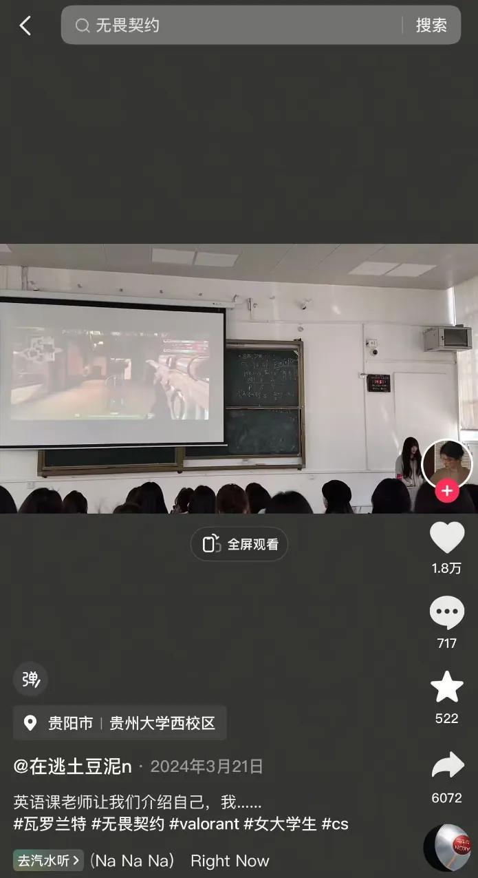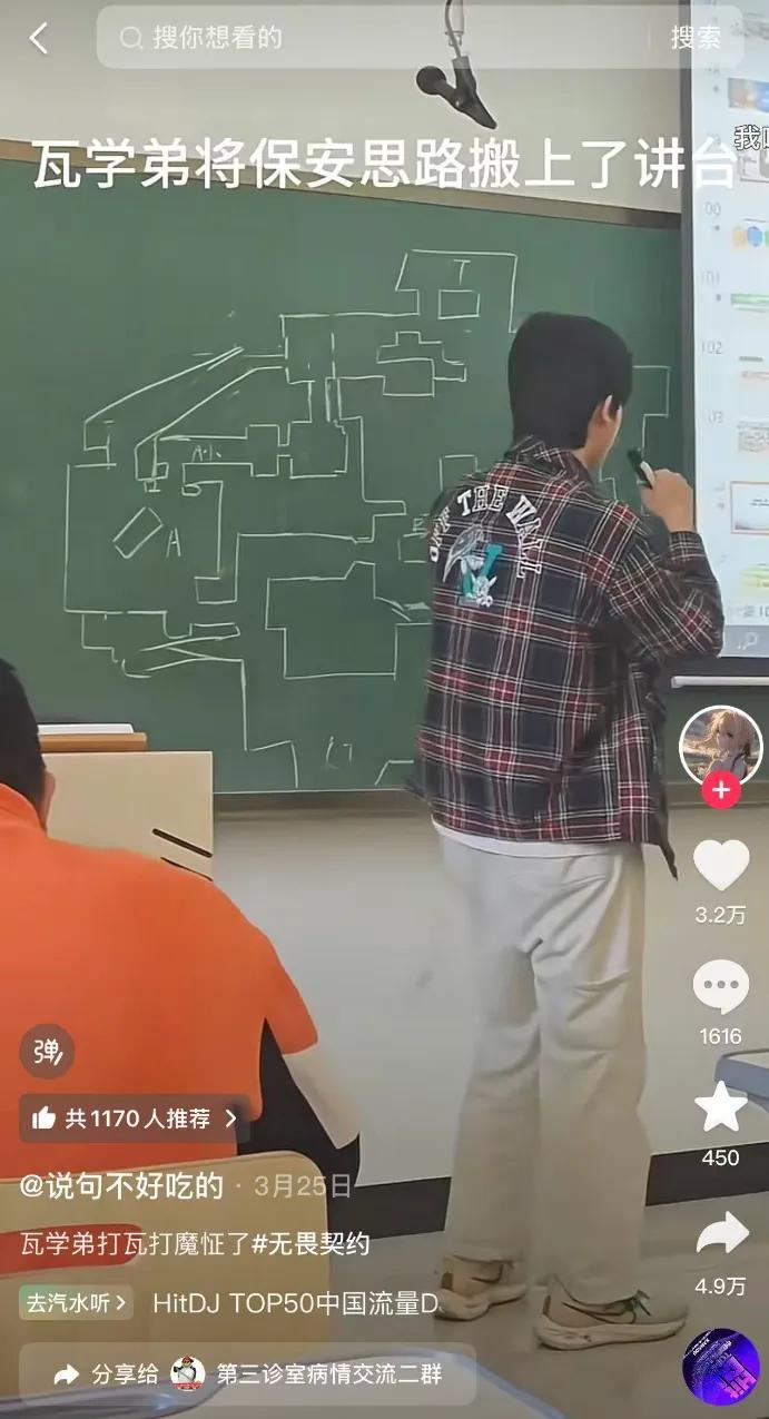 瓦在成了個新的社交名片。比如抖音上有個爆火視頻,講的是老師讓上臺分享在校最快樂的事,然後有個男大就發了自己打瓦的五殺視頻。而在評論區,能發現有網友認出了“這是隔壁班的某某”,等他們再見面時,很可能因此聊起來、約一起打瓦。