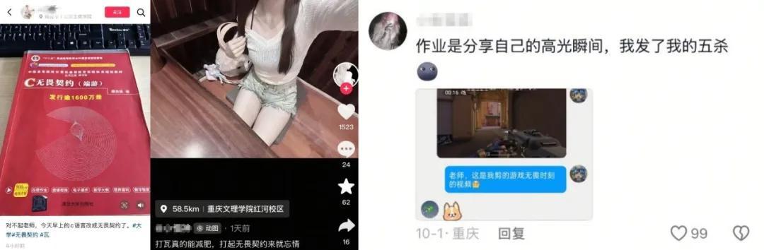 還有教材從C程序設計“魔改”爲了C無畏契約;老師讓交“高光時刻”的作業,發過去的是自己剪的“無畏時刻”視頻;就連減肥,也會被大學生理解爲是瓦幫助了自己“少喫”……