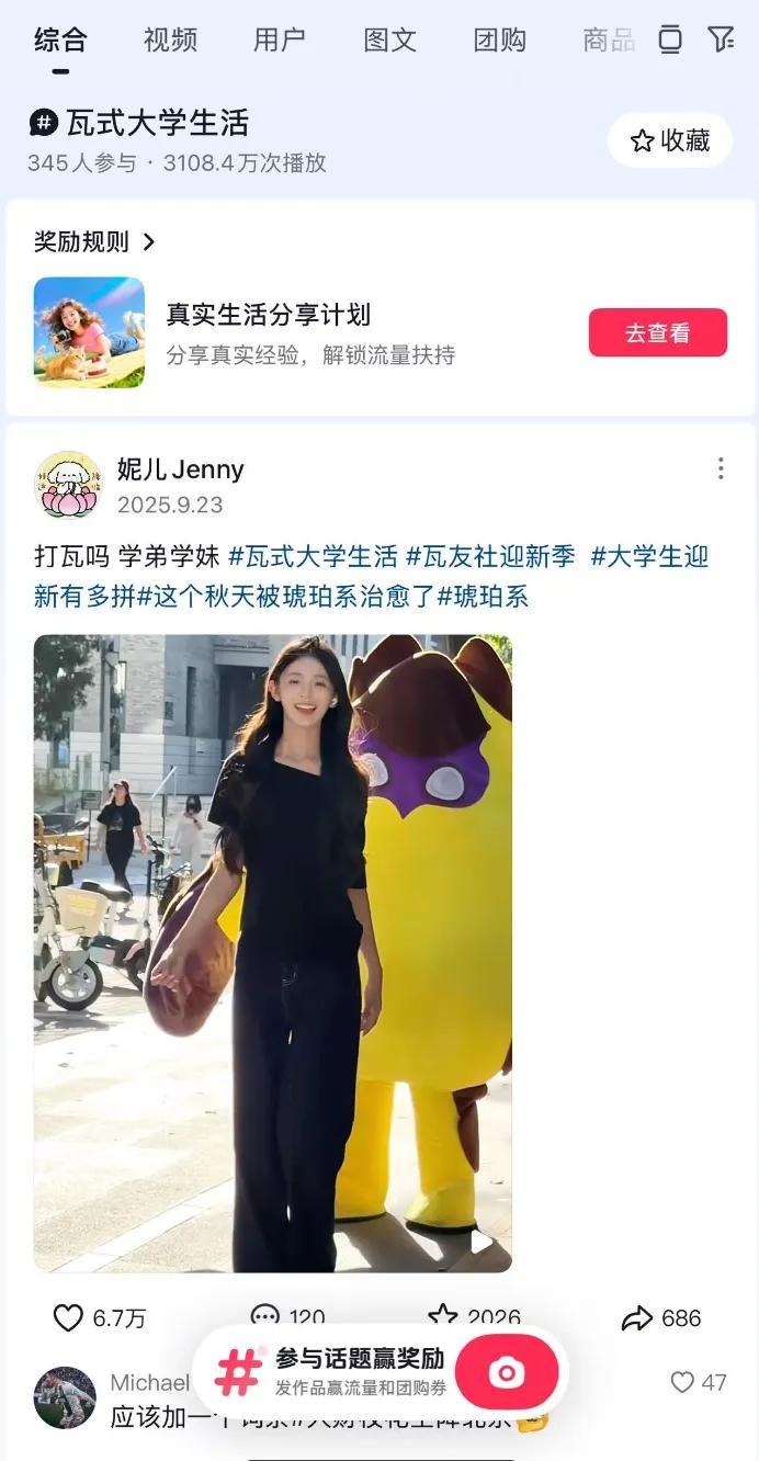 其實,從某種意義上說,短視頻時代讓“分享生活”變的更容易,而大學生本身也是社交與表達欲爆棚的一個羣體,再加上瓦潮流的調性和有趣的文化底蘊,成爲大學生創作與分享的“源泉”也是一個很自然的事情。