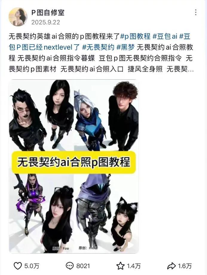 當男大、女大都成了“瓦大”,越來越多人被帶動加入了瓦延伸出的社交新玩法,比如很多女大在個人賬號發“以瓦奶媽技能改編的簡單手勢舞”,再比如前段時間通過AI實現與遊戲角色合影玩法爆火,玩瓦的大學生也是參與其中最活躍的一批人。