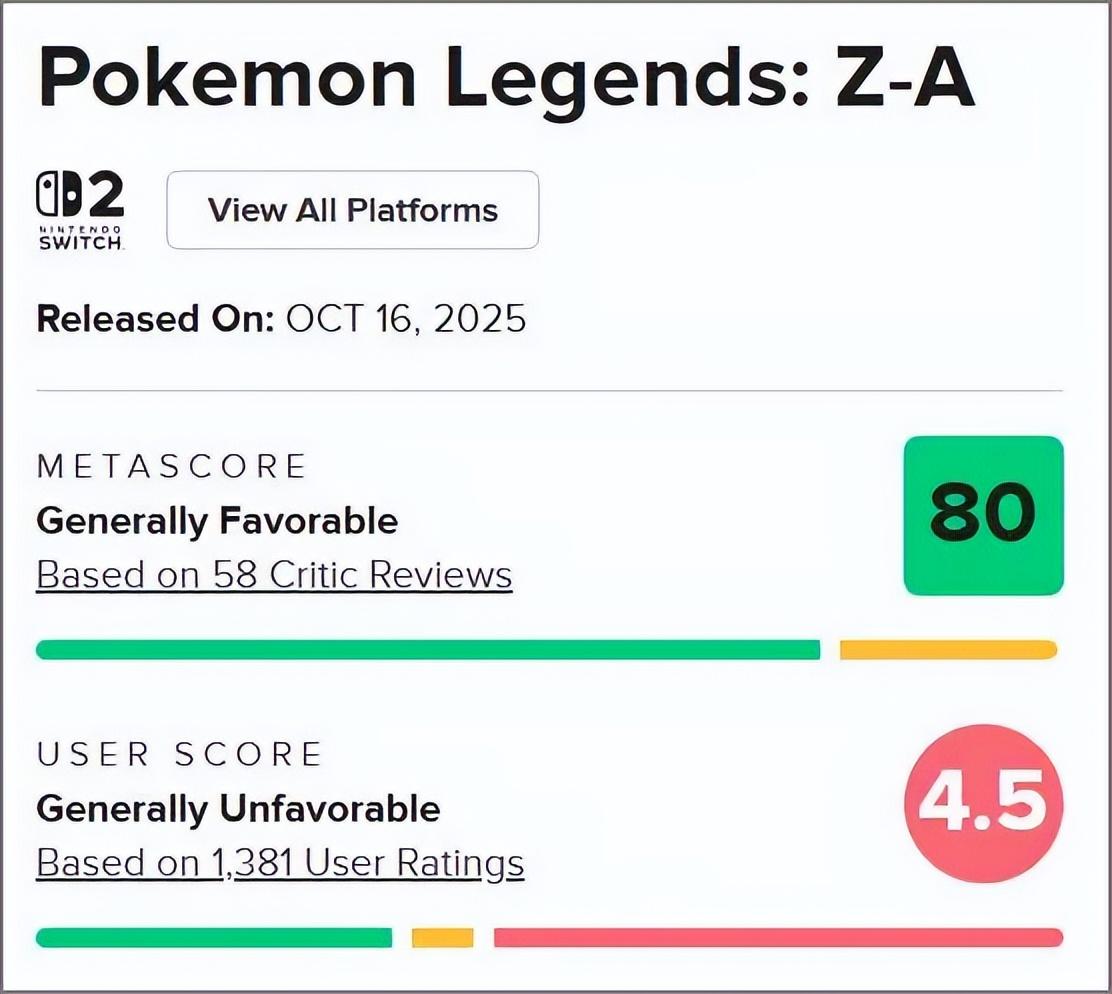 對於《寶可夢》來說,看評分這事兒基本沒啥意義。《ZA》的媒體均分是80分,這分數放到其他系列是缺陷不容忽視的中庸之作,但放在《寶可夢》的標準下……