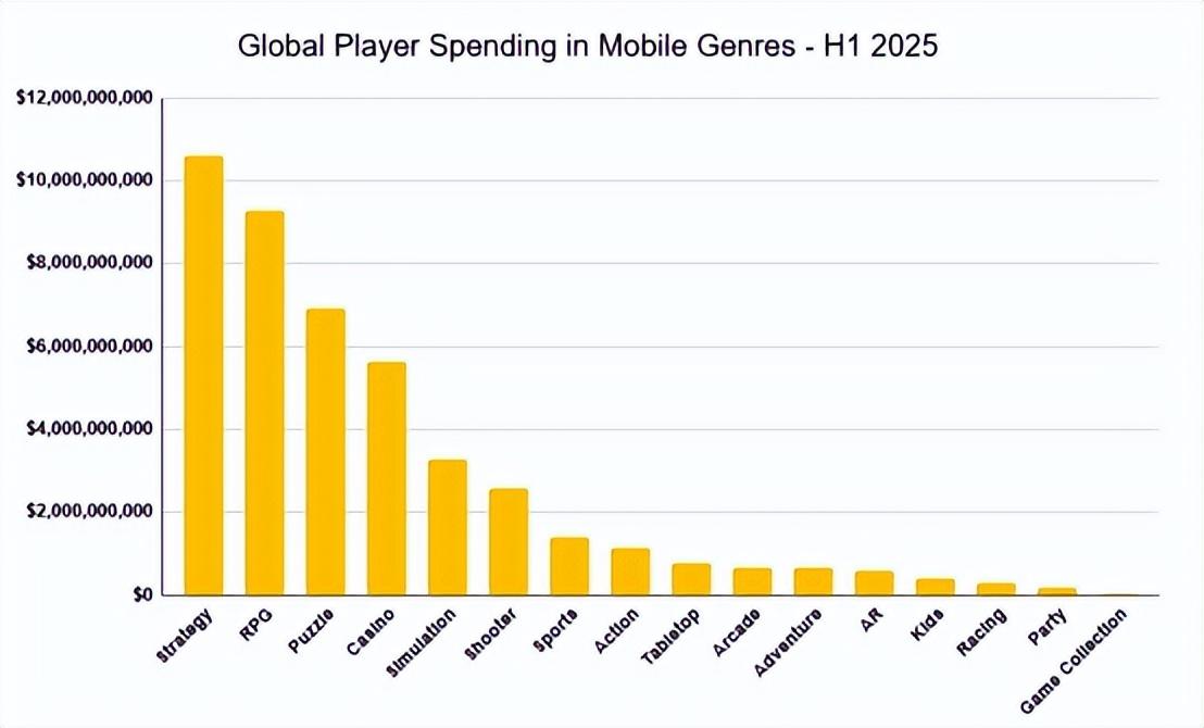 據AppMagic測算,2025年上半年,全球移動遊戲市場的品類格局已有質變——策略以超過106億美元的總收入超過RPG,成爲全球收入規模最大的遊戲品類,佔比約24%。同比增速達到26%,排名第三。