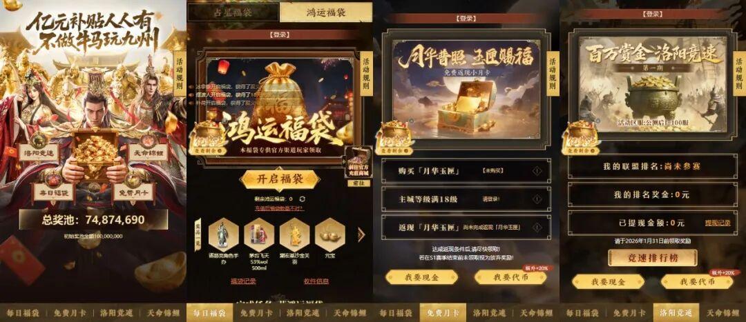 公測投入的“億元補貼”活動更是進一步助推了遊戲熱度。人人有份的“月卡報銷”,結合遊戲不賣VIP、不賣加速、不賣資源的設定,讓微氪零氪玩家也能獲得良好的遊戲體驗,大幅降低了新玩家入手門檻。而幾乎已成爲SLG標配的“洛陽競速比賽”,在《策定九州》則體現爲單盟最高的20萬元現金獎勵,也有效刺激了大R玩家與公會的參與熱情。