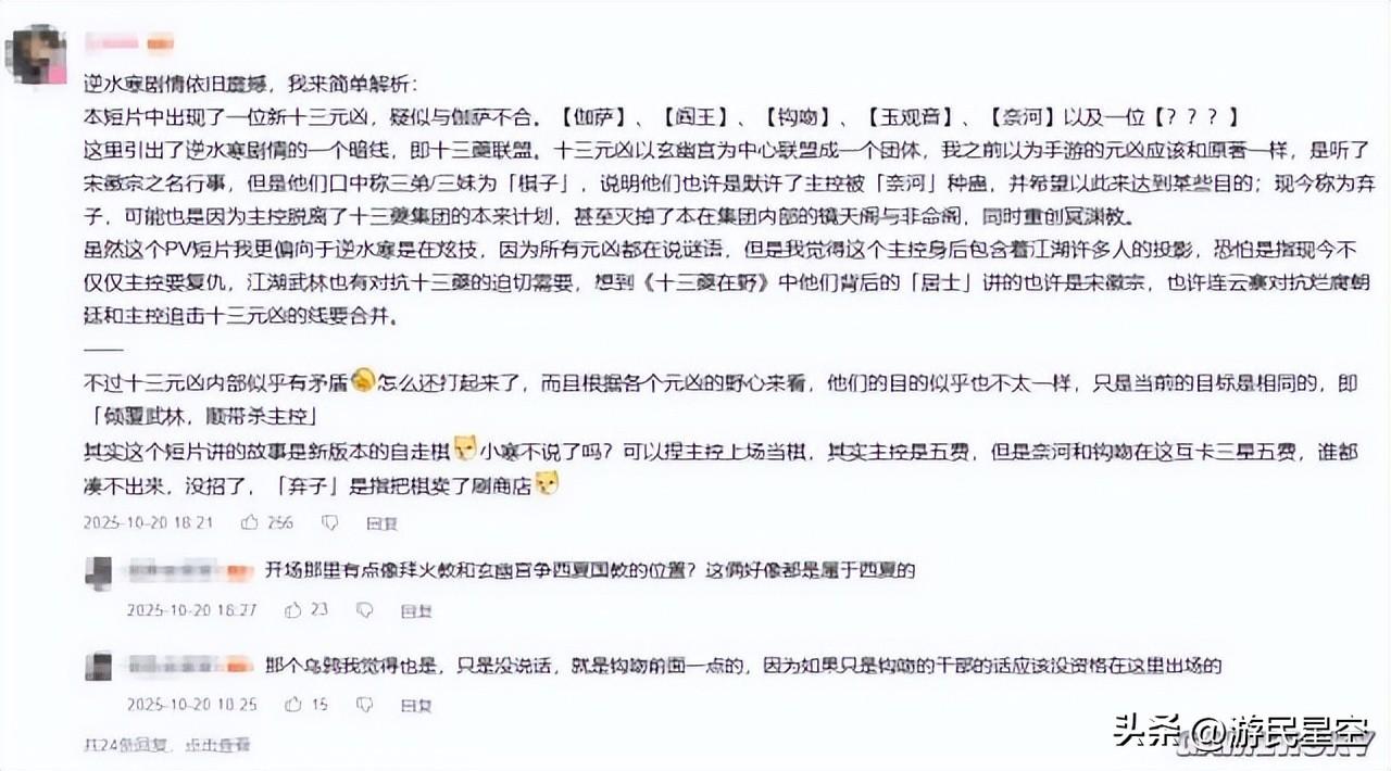 此外,新PV中“十三元兇”內部的不和、身後同門故友的紛繁剪影、以及戚大哥在結尾的驀然迴歸......這些後續劇情走向的諸多伏筆,同樣也爲這個愈發龐大武俠世界注入了更多可能性。也正如許多玩家在評論區分析的那樣:從某種角度講,《逆水寒》手遊的故事,或許也纔剛剛“開始”。