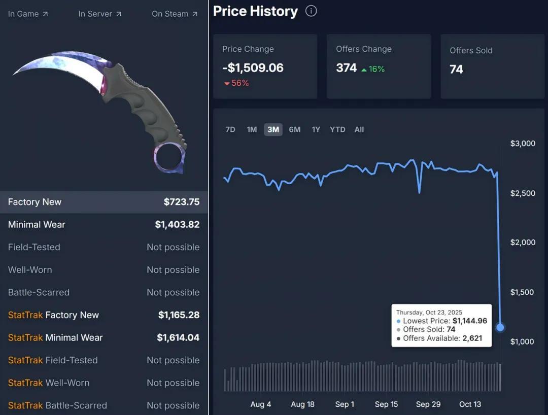 比如先前市場上較貴的武器飾品之一爪刀多普勒(Karambit Doppler),據CSGOSKINS平臺顯示,其價格從2700多美元驟跌到了1100多美元。
