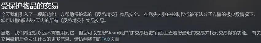 今年7月,V社又給《CS2》更新了交易保護機制。簡單來說,飾品在被交易後,會進入爲期7天的交易保護期(冷卻期),在此期間受保護飾品不可被消耗、修改或轉移,若玩家發現自己被詐騙、賬號被劫、或者不慎將價值很高的飾品交易出去,可以通過這個機制將飾品要回。但撤回交易、要回飾品的Steam賬號會在30天內無法使用Steam市場以及交易功能,並且Steam客服不會提前解封。
