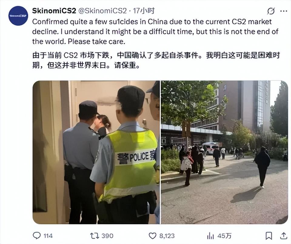 網上還有傳言說,有學生因爲貸款倒賣《CS2》飾品賺差價,這波直接虧到身負重債,選擇輕生。(不過我也刷到有人說傳言裏配的警察上門圖,是從其他不相干的帖子裏挪用的,所以無法確定傳言的真實性)