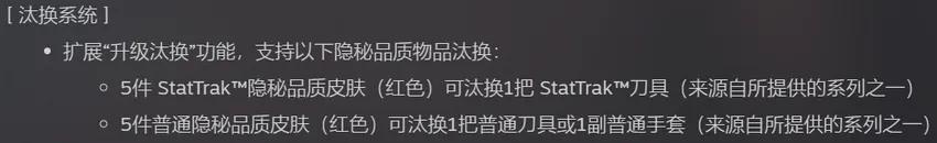 但現在不一樣了——5個紅色槍皮,就能汰換1把刀或1副手套,5個StatTrak™紅槍皮能換1把StatTrak™刀,獲取門檻直線下降。原先因「難獲取」而導致的「高身價」,也隨之崩塌。