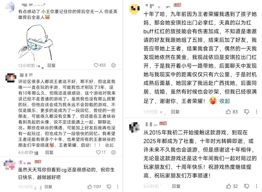 正如這次十週年,翻看《王者榮耀》玩家的評論後,我發現很多人留言並不是在聊這是款好遊戲還是爛遊戲,而是在講述自己因爲《王者榮耀》和他人產生的鏈接,或是感慨《王者榮耀》留給自己的回憶和陪伴……大家對《王者榮耀》的印象已經跳出了遊戲本身,更多想到的是人生百態的經歷。