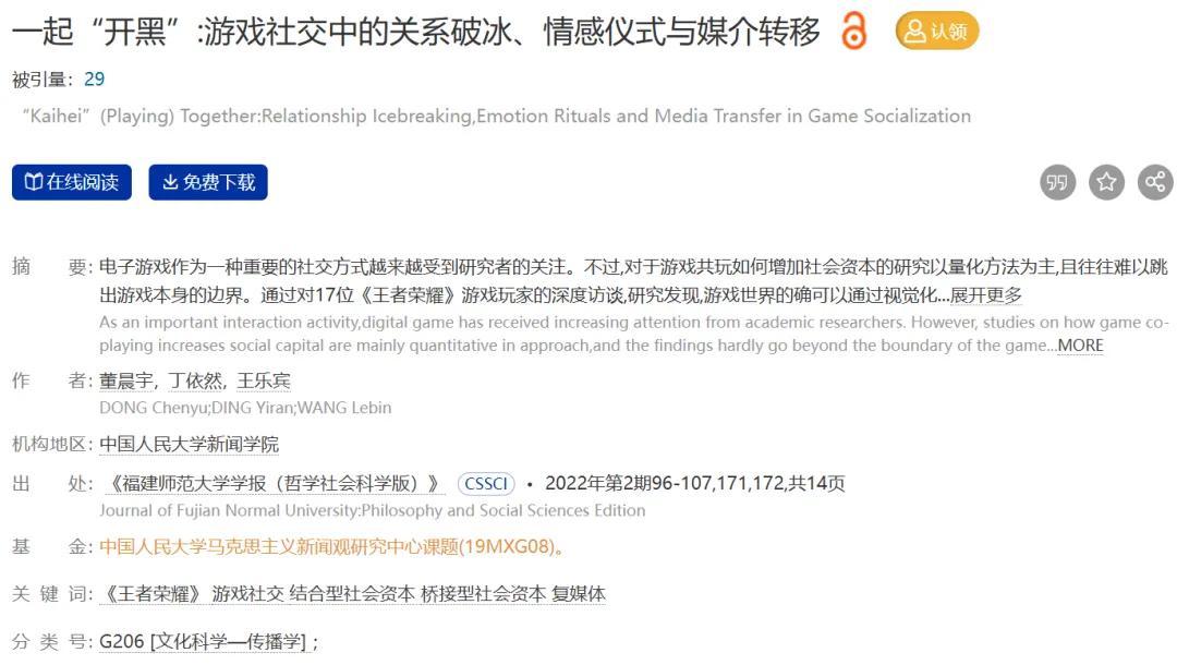 更關鍵的是,低門檻,且競技、娛樂,以及遊戲內外體驗皆包的《王者榮耀》,已然成了跨越地域、年齡、圈層的通用社交密碼。2022年,中國人民大學新聞學院副教授董晨宇等人,還對《王者榮耀》的社交破冰效果進行了專題研究,並發表了相關論文。