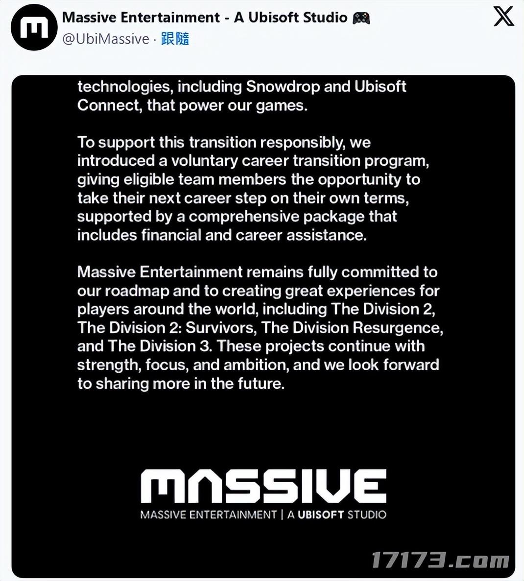 育碧旗下知名工作室Massive Entertainment發佈官方公告,宣佈爲優化長期發展規劃與資源佈局,將對團隊進行重組,並推出一項“自願職涯轉換計劃”,以自願離職的方式裁撤部分員工。