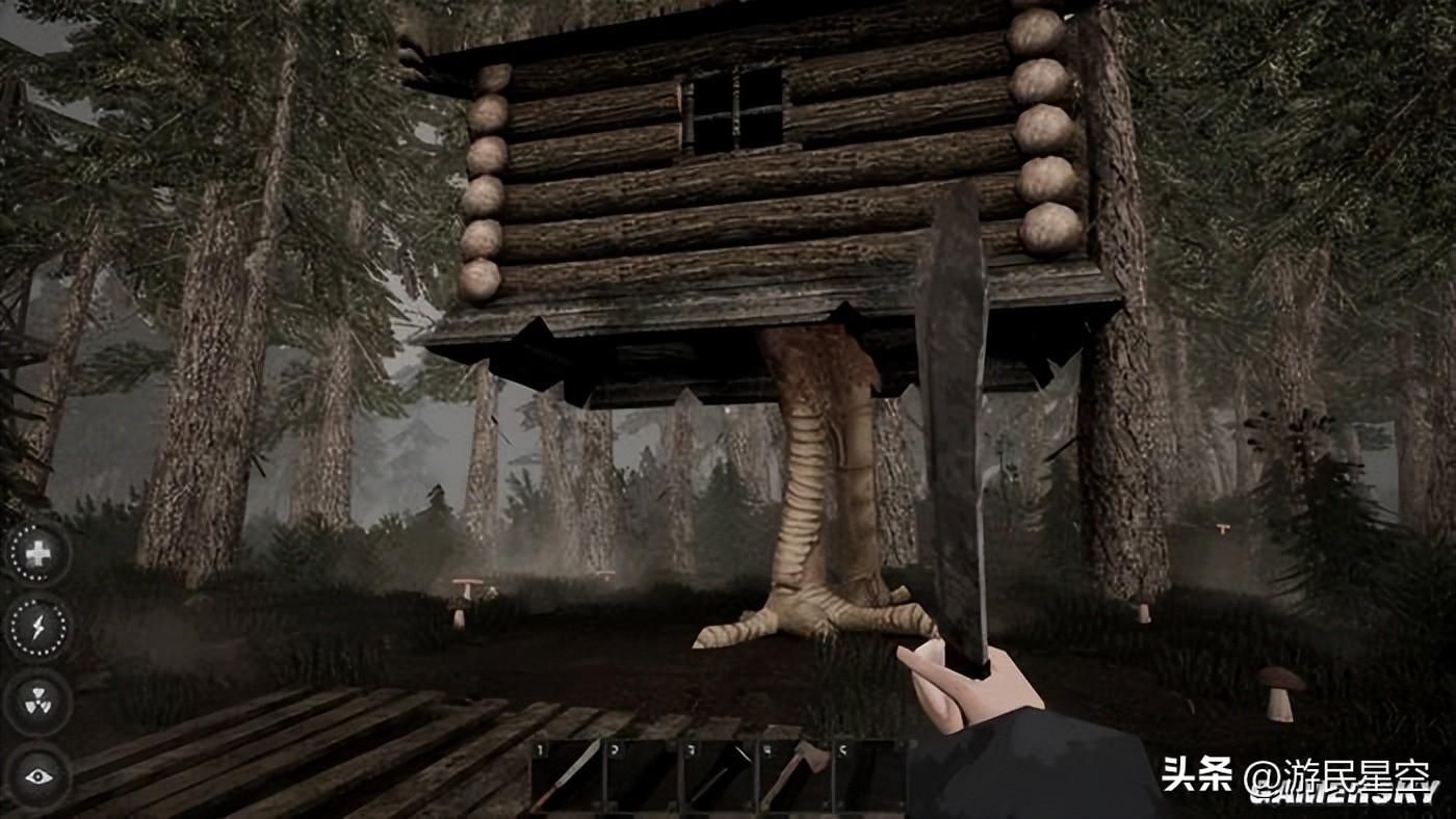 畢竟是核末世背景,受了輻射之後發生怎樣的變異都不稀奇。各種奇葩的設計,也算是遊戲的亮點之一,作者腦洞比較大,屬於是“夢到什麼遊戲裏就做什麼”,比如這個靠近就會長出腿來個180度旋轉的小木屋,很像是生喫了旁邊地上的菌子,才能看到的場景。