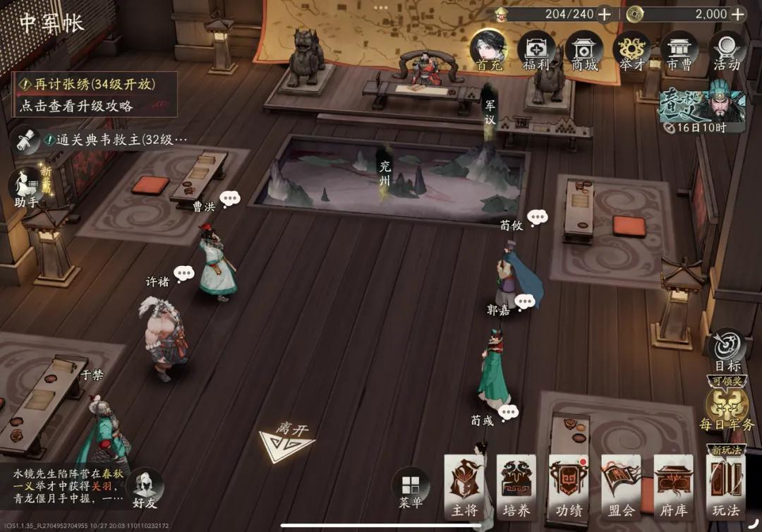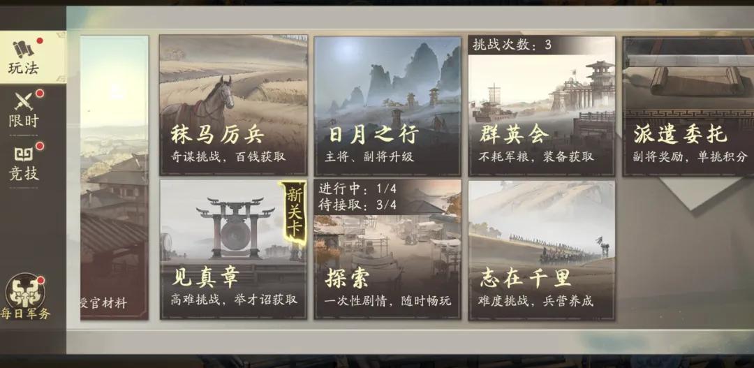 比如說直接關係到角色升級的日月之行,需要玩家預選角色,然後在幾塊區域中進行探索,有劇情、有寶箱、有戰鬥;關係到兵營升級的志在千里,則是把關卡分爲了五個戰場,每打完一個,就可以降低後面戰場的難度。