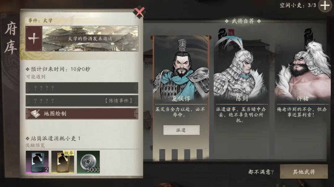 比如說一個尋常的武將派遣收菜玩法,遊戲爲它單獨做了個幕僚府,配上了不少文案,會出現陳情事件,派遣結束後還需要評價武將。但它最終給玩家的體驗,未必就比那些一鍵派遣收菜,除了獎勵什麼內容都沒有的遊戲好。