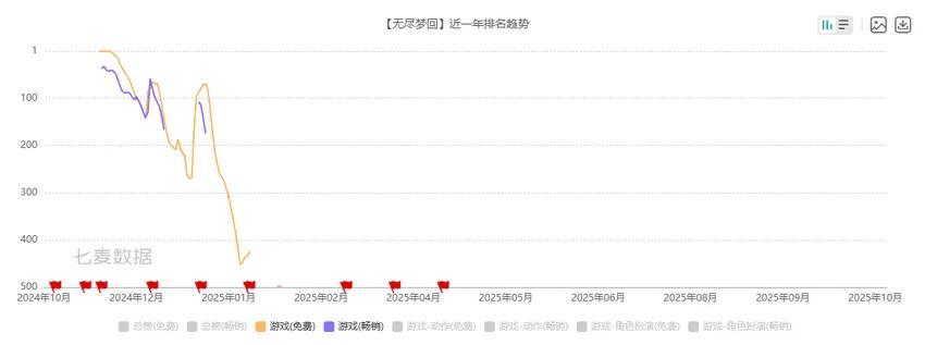 像主打Roguelike玩法的《無盡夢迴》於2024年11月上線,最高衝到iOS暢銷榜33名,隨後便很快掉出TOP200,與此同時,新進幾乎也停了。