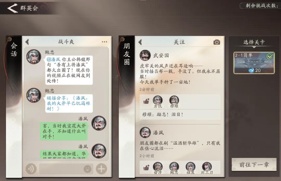 我完全能理解團隊希望把各個玩法都做出差異化,給玩家豐富體驗的想法,從結果上看,這些模式確實也呈現出了更多的內容屬性,甚至多到有點溢出了。像這個裝備本里就塞了武將之間的微信對話和朋友圈評論,每一關都不一樣。