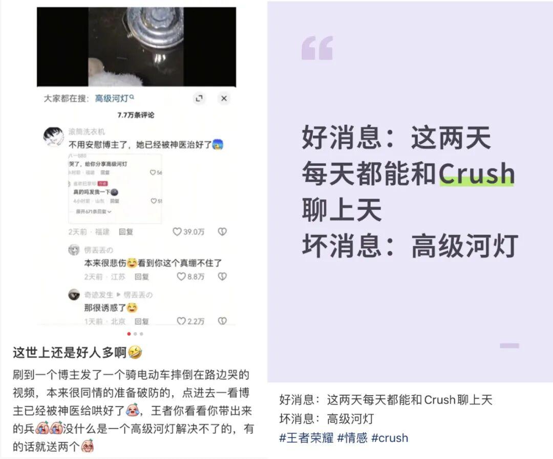它源自《王者榮耀》裏一種可以獲得遊戲內福利的道具,而如今,它早已跳出遊戲,成了一種新的社交貨幣。比如,有網友發帖說騎電瓶車摔倒、飯也不小心打翻了,很難過。評論區並沒人說“抱抱”或“再買一份”,而是排起隊形:“別哭了,送你一個高級河燈” 難過似乎真的被這戲謔的善意驅散了。又或者,有人想找crush聊天又不知如何開口,便會半開玩笑地發去一句:“在?給你個高級河燈” 尷尬瞬間化解,對話自然開啓。