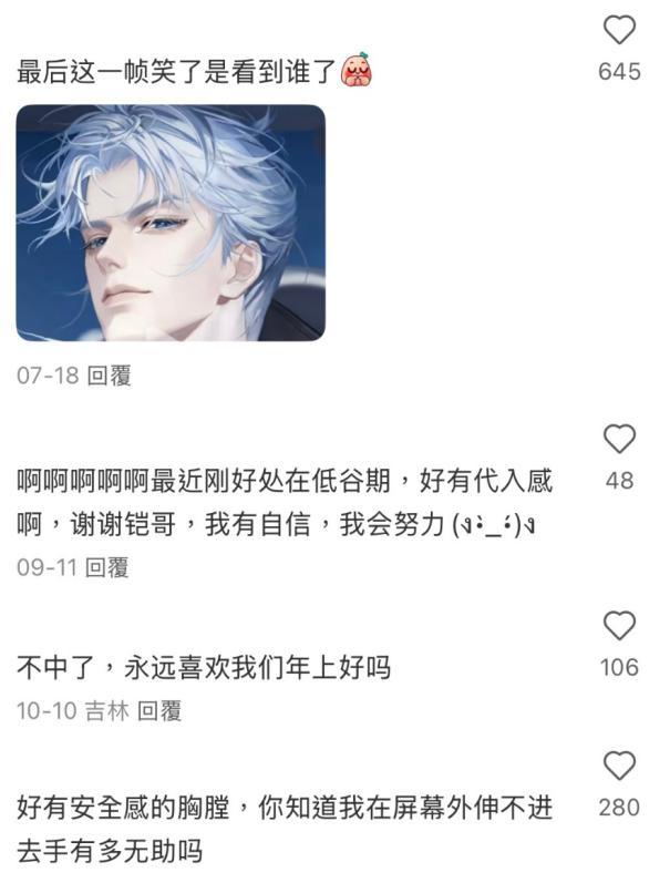 玩家嗨昕喜歡司馬懿許多年,“以前只能靠同人內容喫點‘乙女飯’,從沒想過有一天官方會真的做情感陪伴企劃。”企劃發佈之後,於她而言最大的變化就是“‘喫飯’的途徑更多了” ,她告訴我,「心動的王者」每一次內容更新,都能讓她感到和他距離越來越近。