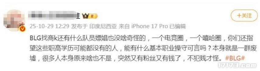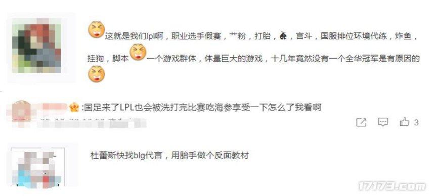 有網友就吐槽,說韓國LCK賽區選手Peanut被淘汰後痛哭流涕,反省自責,BLG這樣的行爲嚴重缺乏職業精神。還有大V直言,職高學歷都未必有的選手突然暴富,缺乏職業操守是必然。