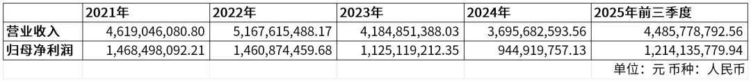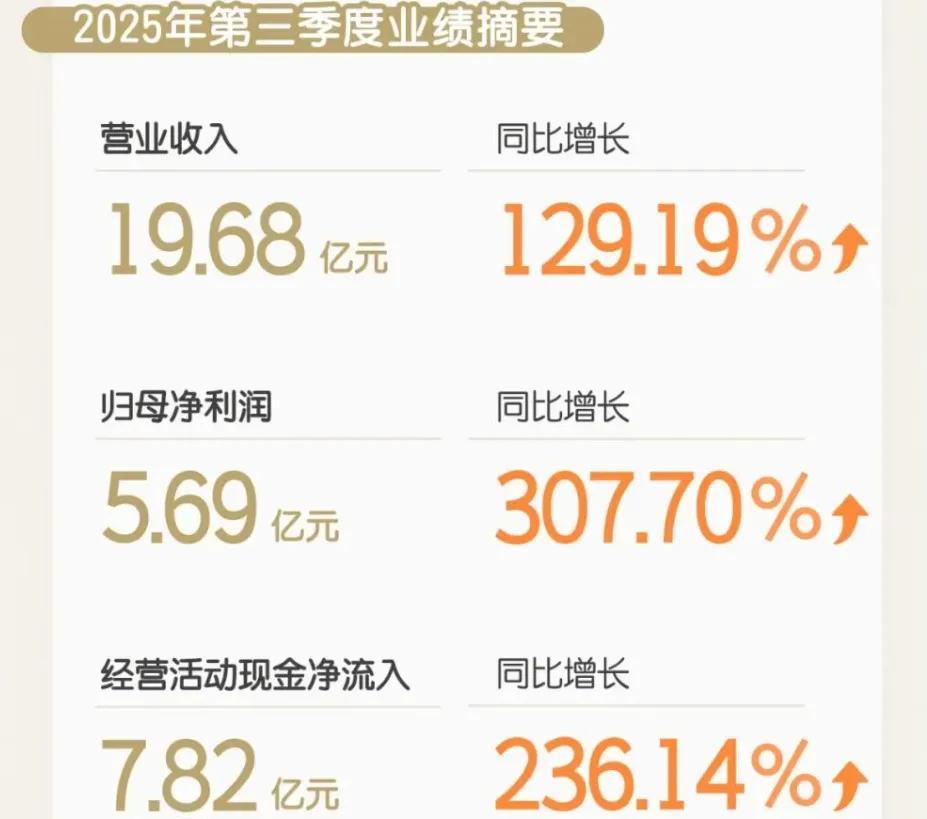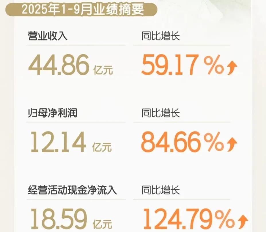公司2025年1-9月(前三個季度)總共營業收入44.86億元,同比增長59.17%;歸母淨利潤爲12.14億元,同比增長84.66%;經營活動現金淨流入18.59億元,同比增長124.79%。