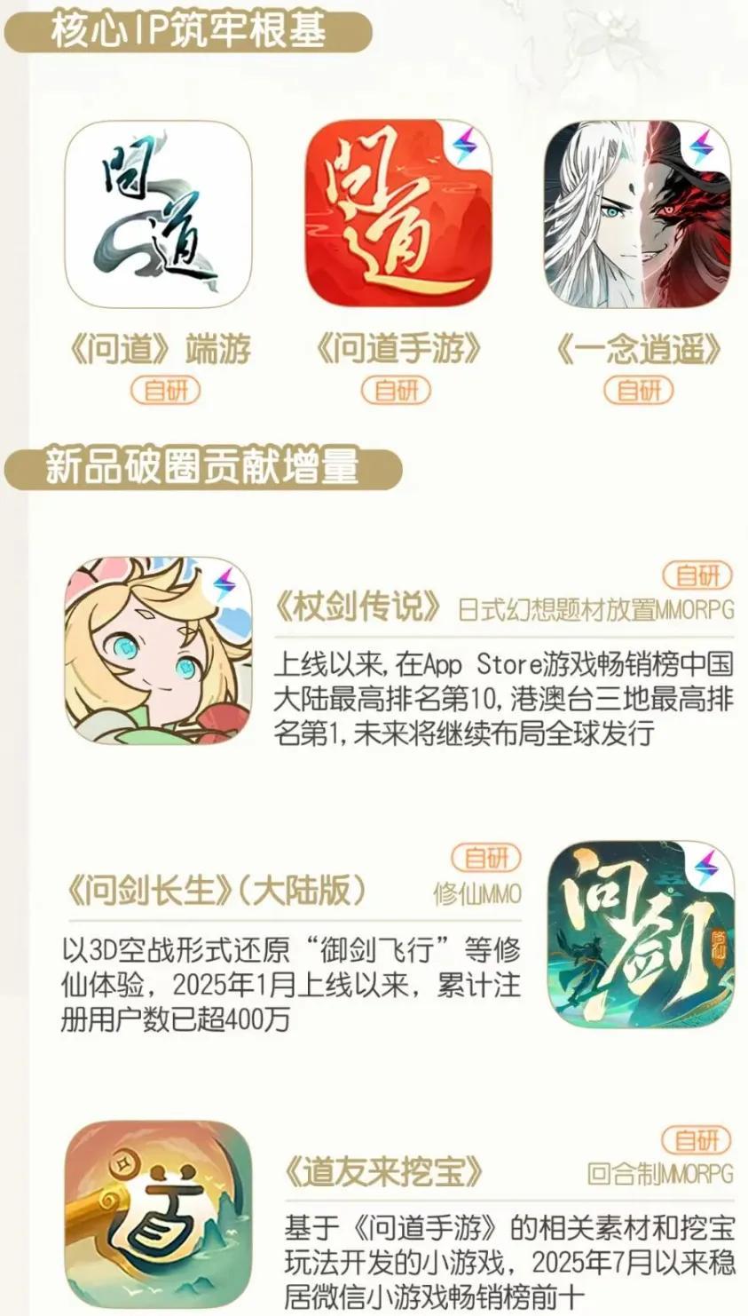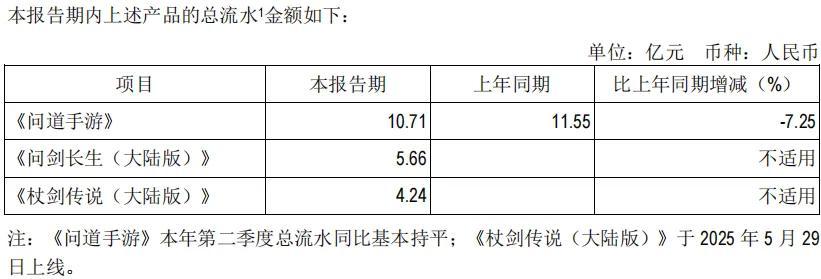 根據財報,今年前三個季度(1-9月),《問道手遊》流水14.99億元;《杖劍傳說(大陸版)》(今年5月29日上線)流水11.66億元;《杖劍傳說(境外版)》(今年7月15日在中國港澳臺、日本等地區上線)流水4.78億元;《問劍長生(大陸版)》(今年1月2日上線)流水7.13億元;《道友來挖寶》(2025年5月9日上線,爲小程序遊戲)流水3.16億元。