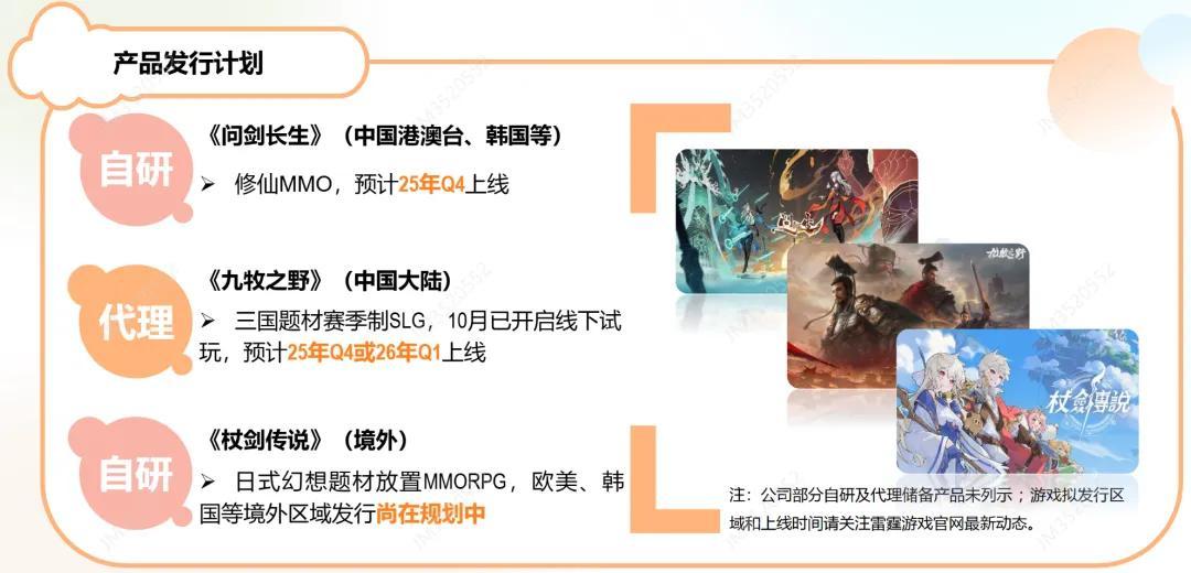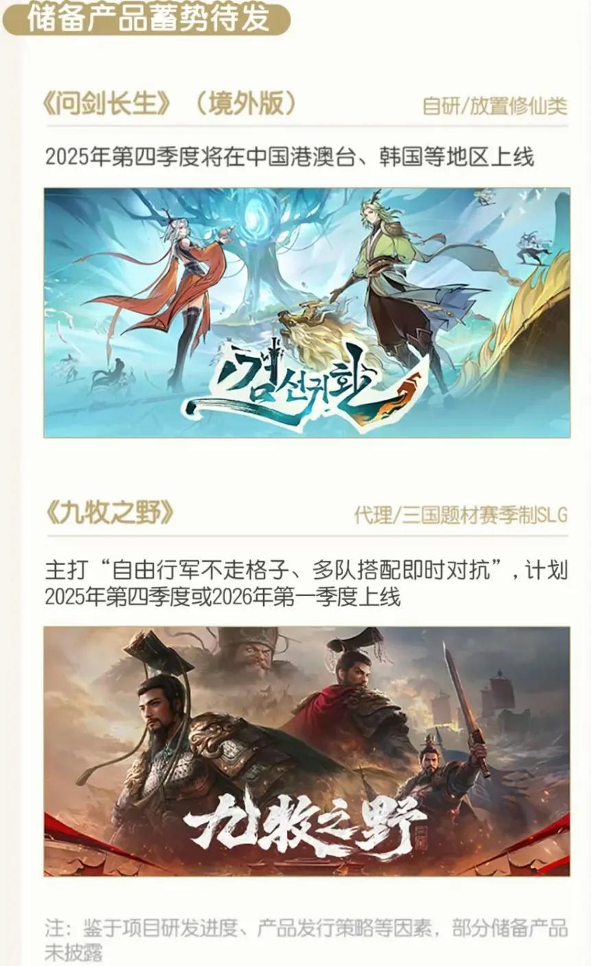 今年Q4,《問劍長生(境外版)》預估將在中國港澳臺、韓國等地區發行;《九牧之野》(吉比特代理的三國題材賽季制SLG)已在10月份進行過線下試玩,可能今年Q4或明年Q1上線;《杖劍傳說(境外版)》在歐美、韓國等地區的發行尚在規劃中。