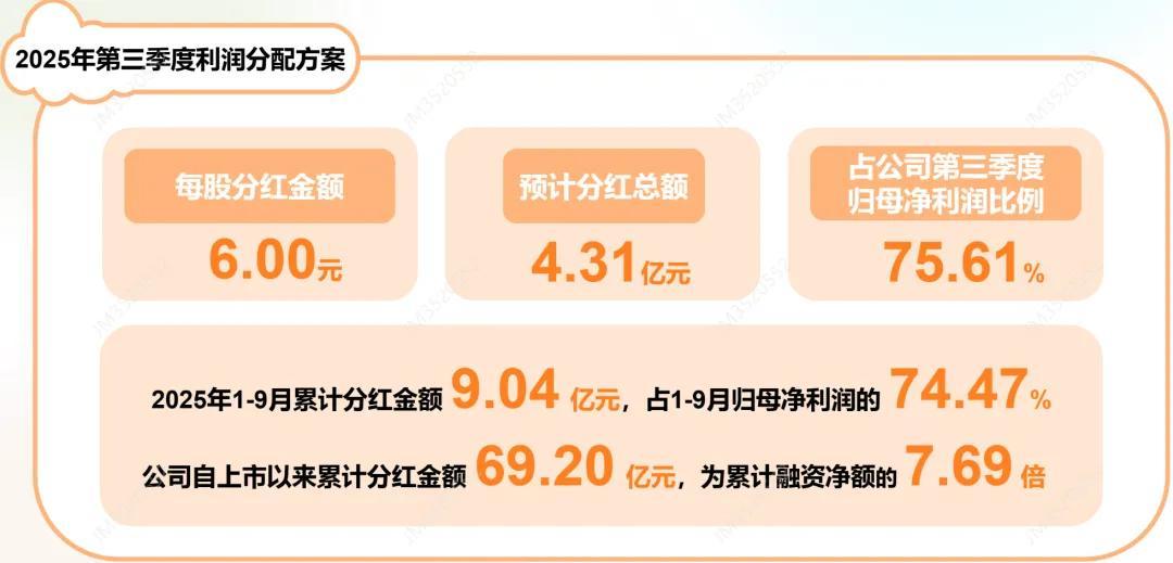 上市至今,吉比特累計分紅69.20億元,是公司累計融資淨額的7.69倍。今年前三季度累計分紅金額9.04億元,佔當期歸母淨利潤的74.47%。