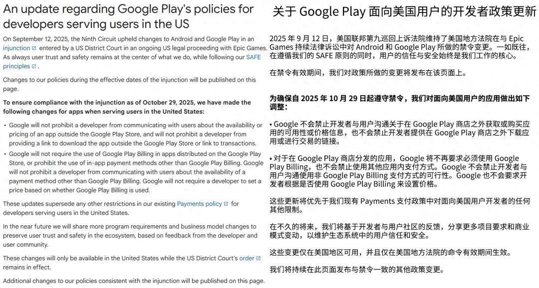 美國時間10月29日,Google(谷歌)官網發佈更新聲明,表示他們將遵循法院頒佈的禁令,在禁令有效期間,在美國地區內,不再要求Google Play商店的開發者必須使用Google Play Billing,也不禁止開發者們使用其他應用內支付方式。
