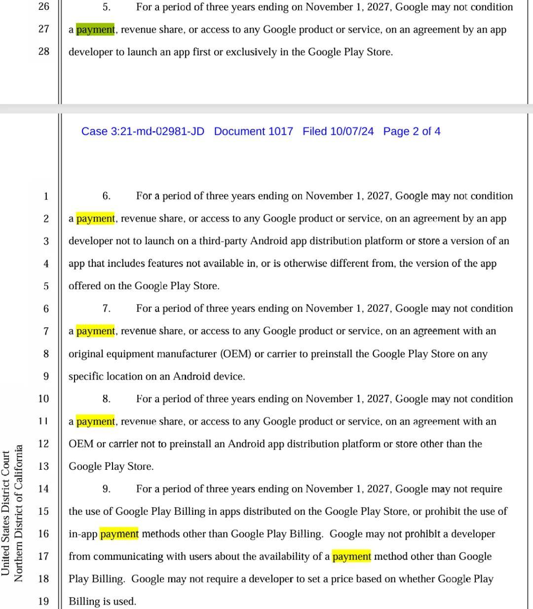 2024年10月7日,法官James Donato做出裁決,命令Google開放Google Play應用商店,三年內不能禁止用戶使用應用內支付方式,必須允許用戶下載第三方安卓應用平臺或商店。