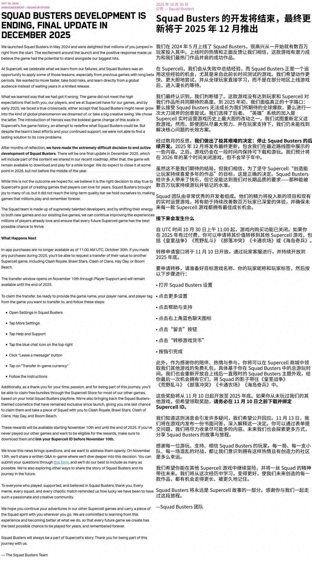 10月30日,Supercell官網發出公告,表示《爆裂小隊(Squad Busters)》將停止後續開發,並預計於2026年(不早於年中)關停。