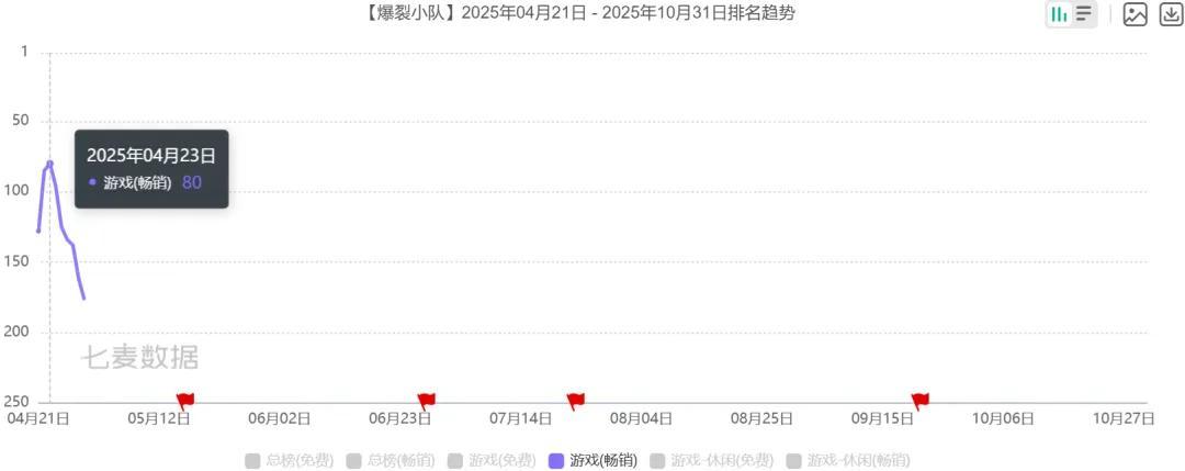 今年4月,《爆裂小隊》國服開啓限號不刪檔全渠道上線,在不推廣不買量的情況下,首日登免費榜Top 3,在暢銷榜最高曾登Top 80,但也很快掉出了暢銷前200名……