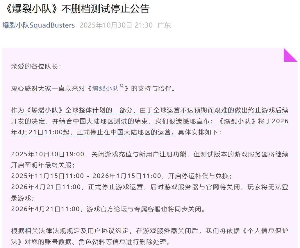 同日,《爆裂小隊》國服也發出公告,表示將在2026年4月21日正式停止遊戲運營。