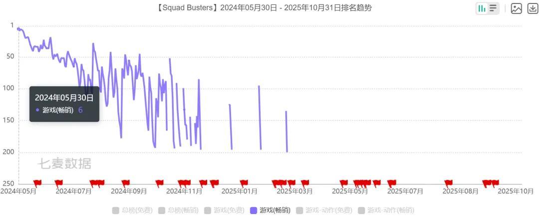 以歐美地區較具代表性的美國市場爲例,《爆裂小隊》上線之初曾登暢銷榜Top 6,屬於高位開局,但不到一年就掉出了暢銷前200名;
