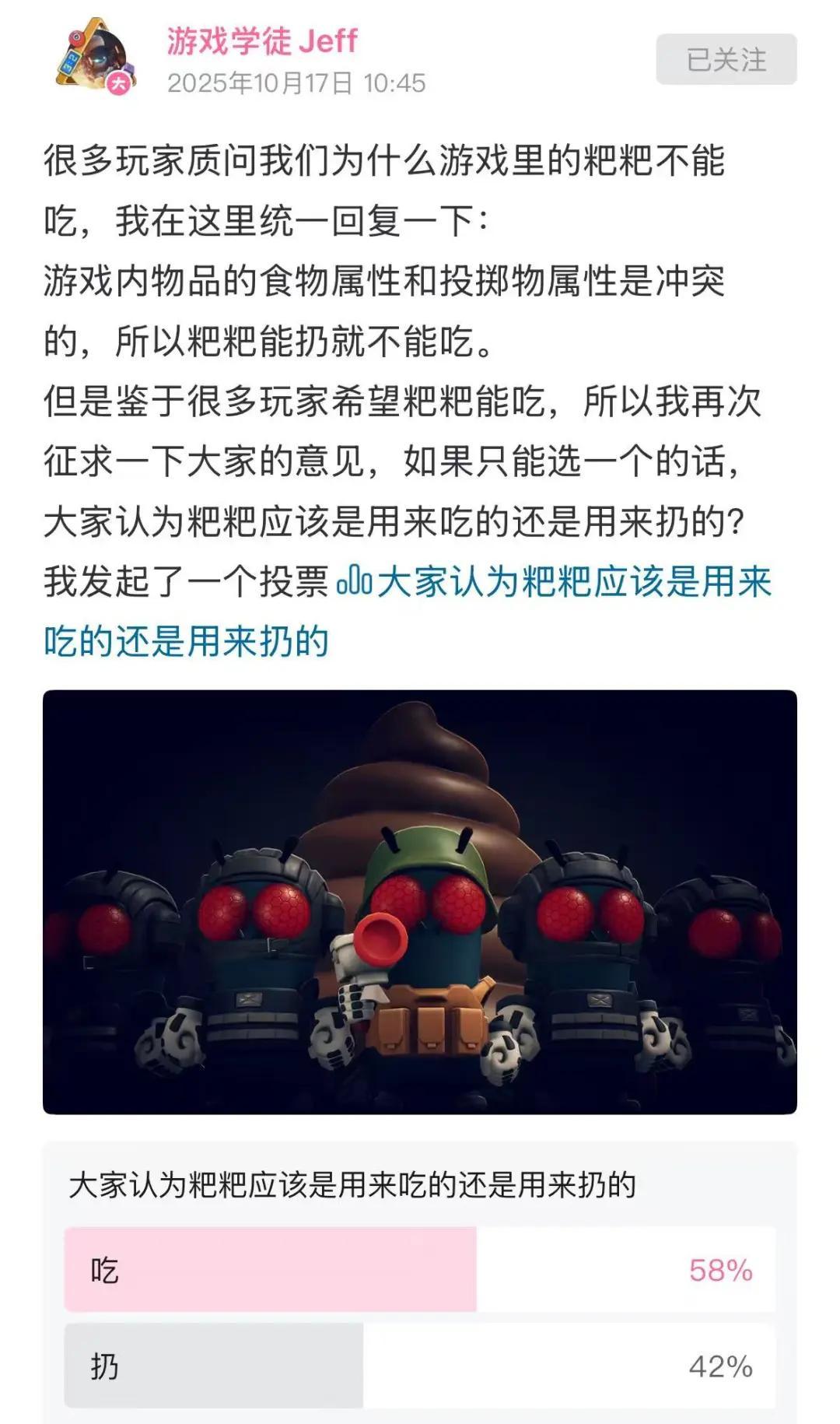最後,當看到“粑粑應該是食物”佔據上風時,Jeff只能留下3個字:那行吧,並在遊戲中實裝了改動。當然,他們還是做了一個新的投擲物道具:糞球,從而讓兩邊玩家都能心滿意足。