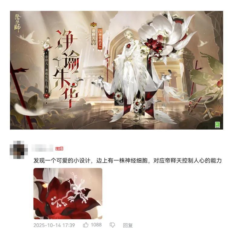 另一款帝釋天新典藏皮膚,則嘗試融入了西式奇幻元素。整體以純白聖潔的禮服爲基礎,點綴暗紅色彩,背後花瓣設計繁複華麗,呈現出不同於以往的神話美學風格,也收穫了不少玩家的正面評價,在一定程度上增強了玩家對團隊美術創新能力的信心。
