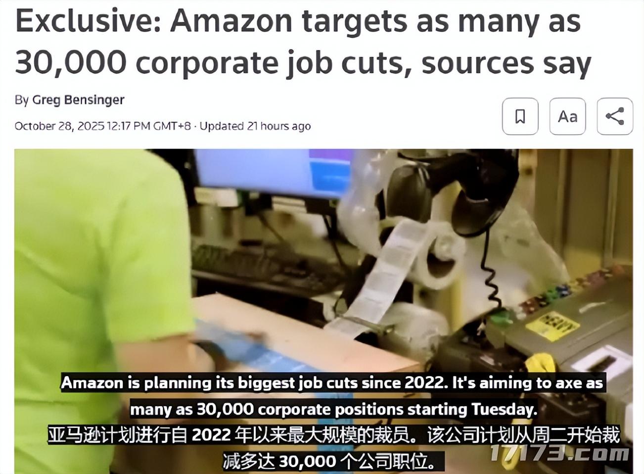 10月底,路透社傳出消息稱,亞馬遜正計劃啓動新一輪大規模裁員,涉及人數高達3萬人,將成爲自2022年底裁員約2.7萬人以來,其歷史上最大規模的一次人員收縮。
