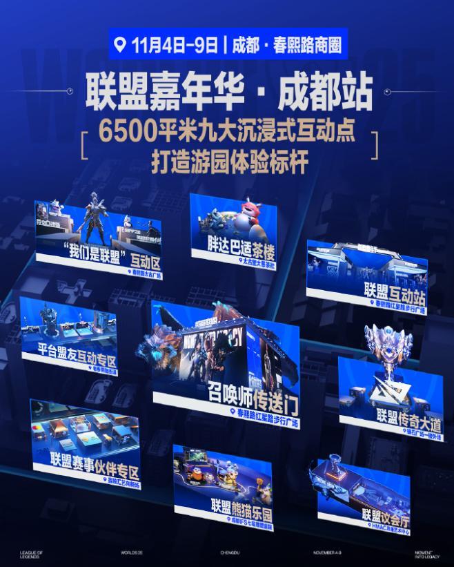 同時,11月4日-11月9日,在成都春熙路上,英雄聯盟史上最大的粉絲慶典活動——2025聯盟嘉年華·成都站也同步開展,9大互動區、6500平搭建面積、5個頂級商業體聯動,爲來自全世界的英雄聯盟召喚師們開啓盛典!