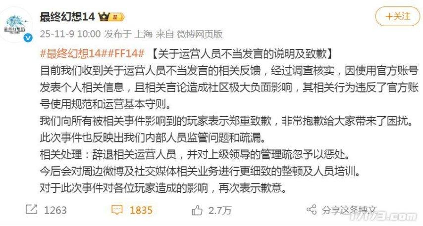 直播後的第二天,《最終幻想14》國服官方終於下場了,表示致歉並開除涉事員工。