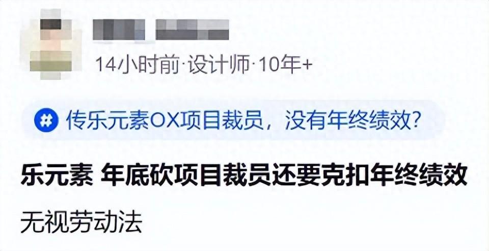 最近,有樂元素員工在脈脈上實名稱,公司名爲OX的項目被砍、裁員,且被裁員工沒有年終績效。根據他的說法,OX項目隸屬於樂元素旗下、位於上海的白銀工作室,是一款UE5二遊。該話題很快衝上了脈脈話題排行榜。