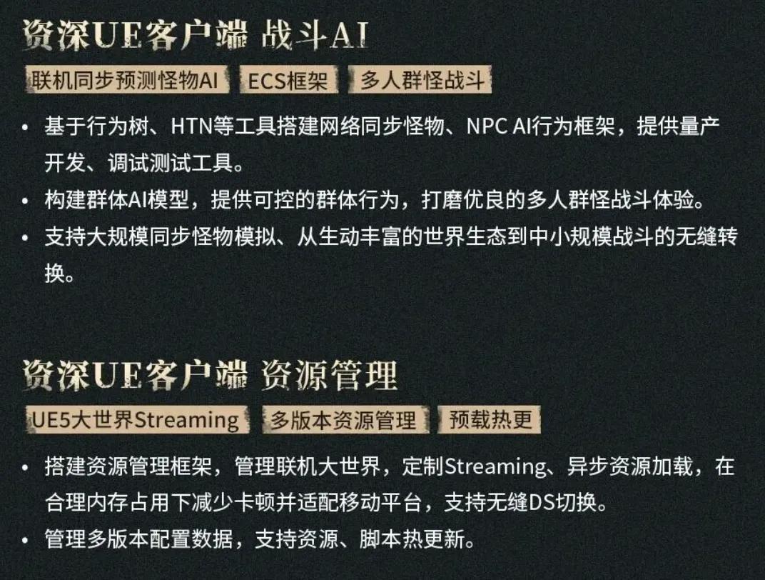 在技術層面,比較典型的崗位爲資深UE客戶端,並要求遊戲支持大規模同步怪物模擬和生態動態切換,爲多人協作和戰鬥連貫性提供基礎。