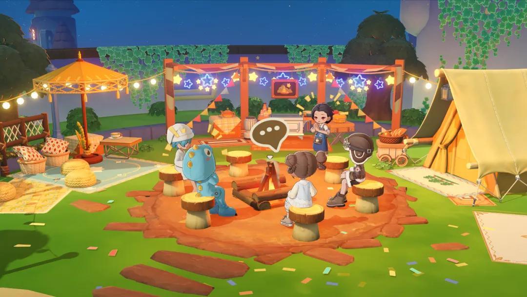 第二種場景,則是遊戲專門設計的,用來社交的星空街市。這裏就像是派對遊戲的廣場,你能看到場景中的所有玩家,大家可以坐在篝火旁聊天,也可以到咖啡廳喝一杯,又或者一起玩點小遊戲。