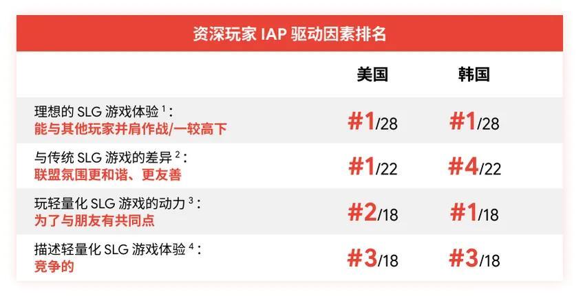 《洞察》將付費玩家的驅動因素排了序,美韓兩地玩家都將「盟戰」放在了第一位,這表示即便是輕量SLG,玩家最後的付費轉化還是要靠多人PVP玩法。