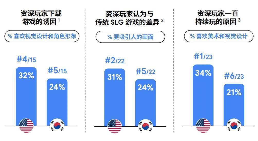 不過有意思的是,美韓兩地玩家在這方面展現出了很大的不同,美國輕量玩家對於美術風格、角色形象的看重程度,要遠高於韓國輕量玩家。而這一點,可能也是源自歐美手遊玩家與亞太手遊玩家的成熟度差異。