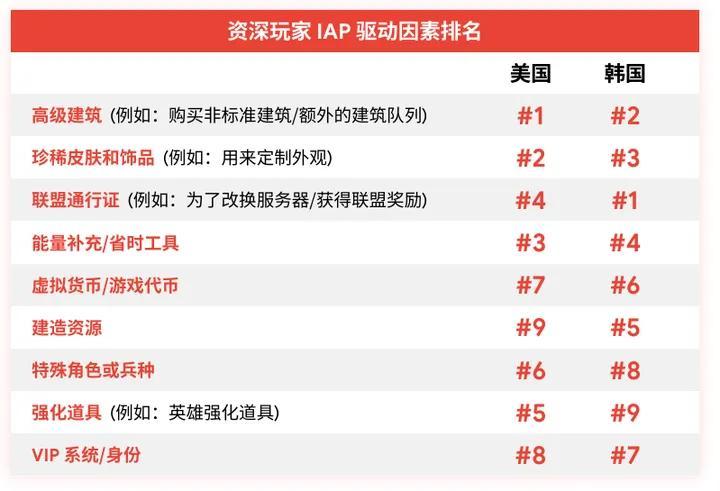 而在所有付費項目中,美韓玩家也表現出相當的一致性,只是存在細微差別:美國更在乎高級建築,韓國則是更看重聯盟通行證,前者偏向單人體驗,後者看中團隊利益。
