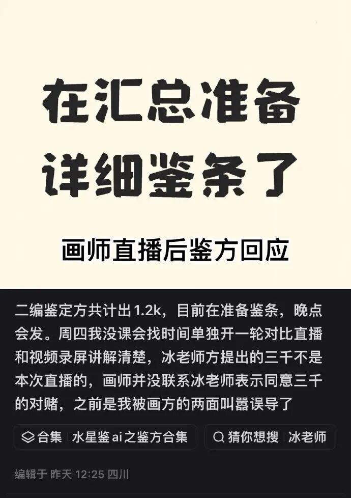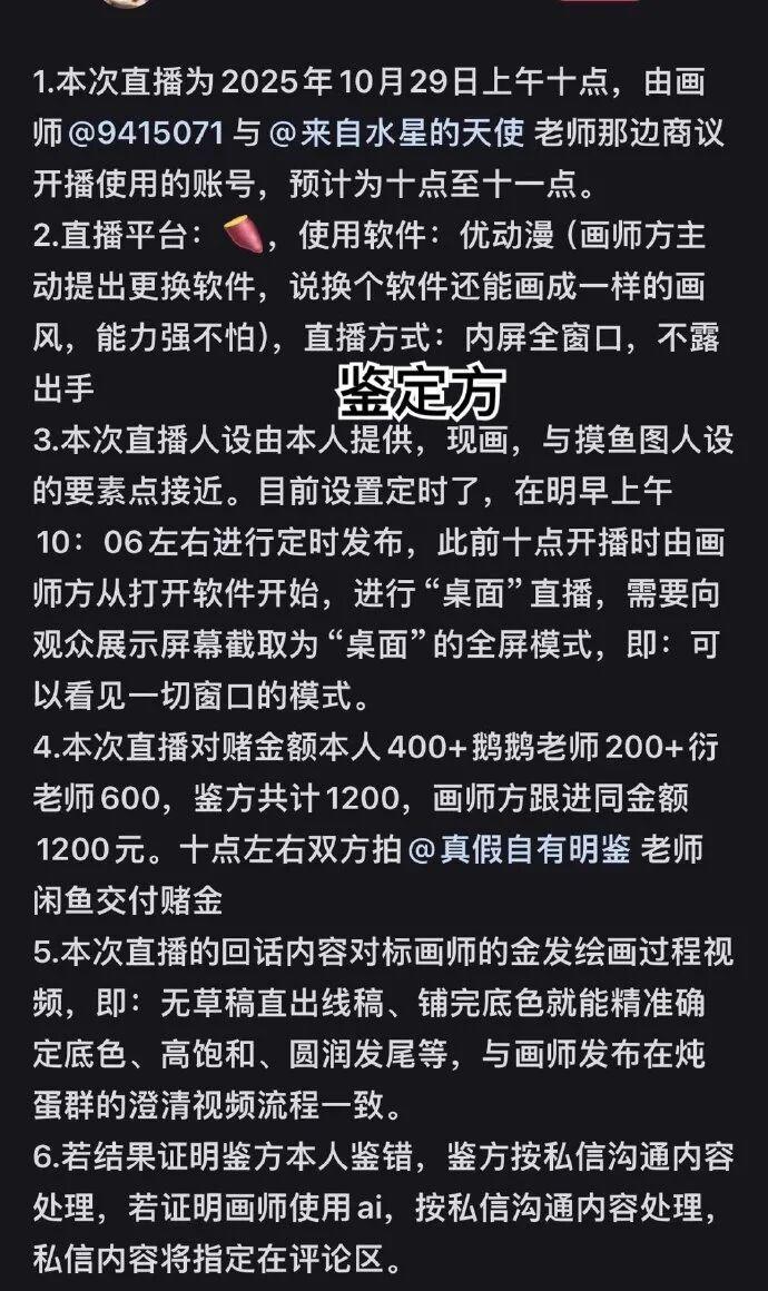 而當對賭的畫稿完成後,新的問題與爭論接踵而至:畫師在直播見證下證明自己這幅畫是純手工繪製,圍觀的路人們也認爲這事應該很明瞭了,結局應該以鑑方道歉給錢結束。