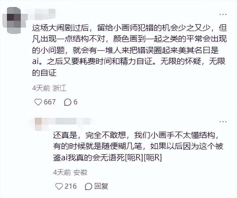 會不會被搶走飯碗尚且不論,他們時不時因爲自己繪畫邏輯透視沒摸準,又或者是上色技巧哪裏有問題被空口鑑AI而陷入自證陷阱,也是常有的事。